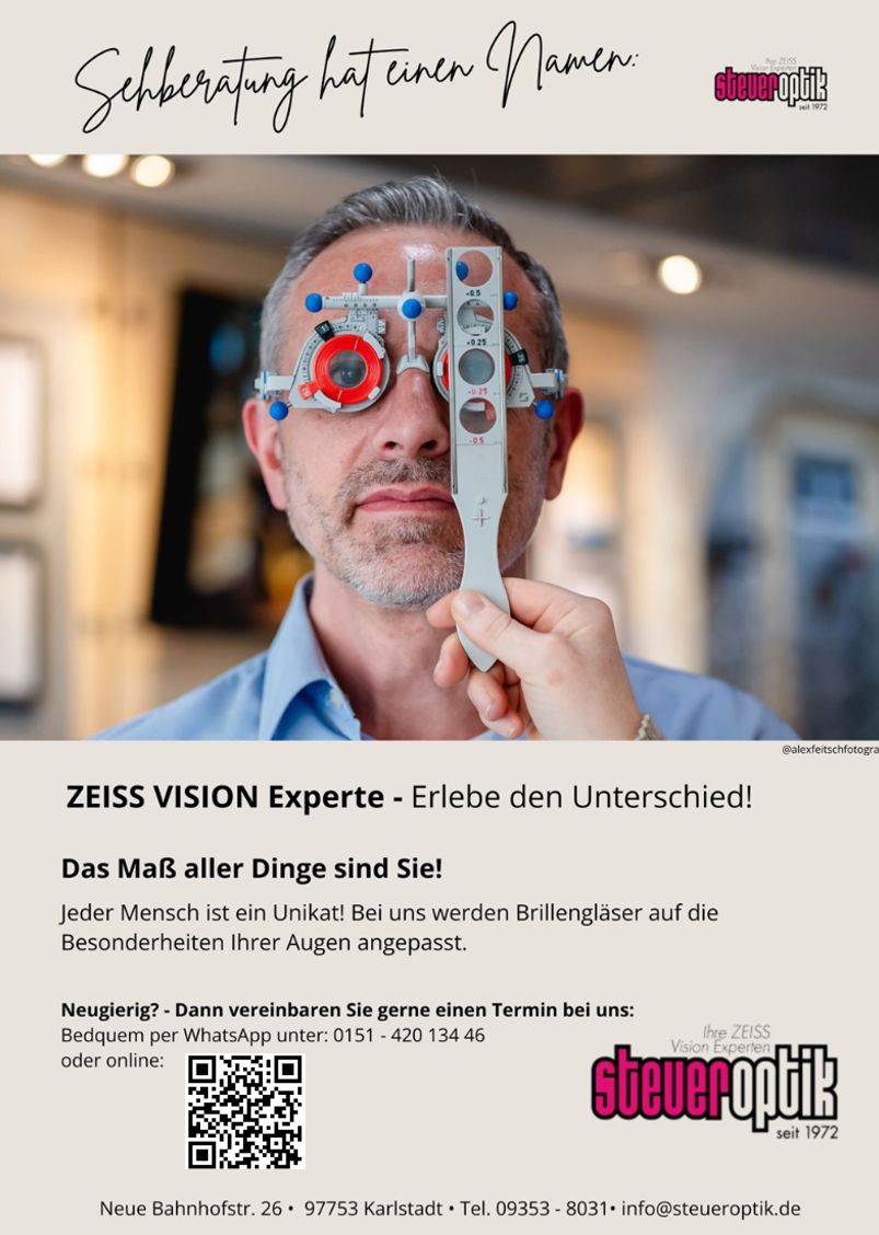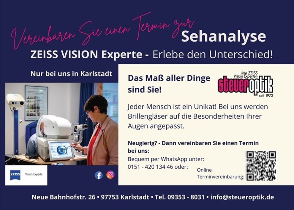 Seit 1972 bieten wir in Karlstadt unseren Kunden eine optimale Betreuung und hervorragenden Service. Durch Jahre lange Erfahrung und Weiterbildung sind wir in allen Gebieten rund um das Auge Ihr richtiger Ansprechpartner. Besonders stolz sind wir darauf, dass wir uns auch technisch auf dem höchsten Niveau bewegen. Durch den i-Profiler von Zeiss sind wir seit 2018 Zeiss Vision Experte. Dies ermöglicht es uns, Ihr Auge noch genauer zu betrachten. Das Gerät erstellt eine „Landkarte von Ihrem Auge“, was uns nicht nur Ihre Art der Fehlsichtigkeit oder ob sich Ihr Tag- und Nachtsehen unterscheidet darstellt, sondern gibt uns auch die Möglichkeit, Gläser mit 1/100 genauer Messdaten anzufertigen. Alles, um ein für Sie optimales Sehvergnügen zu erreichen.
