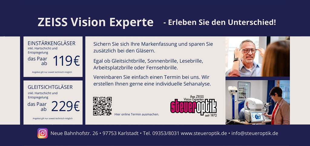 Seit 1972 bieten wir in Karlstadt unseren Kunden eine optimale Betreuung und hervorragenden Service. Durch Jahre lange Erfahrung und Weiterbildung sind wir in allen Gebieten rund um das Auge Ihr richtiger Ansprechpartner. Besonders stolz sind wir darauf, dass wir uns auch technisch auf dem höchsten Niveau bewegen. Durch den i-Profiler von Zeiss sind wir seit 2018 Zeiss Vision Experte. Dies ermöglicht es uns, Ihr Auge noch genauer zu betrachten. Das Gerät erstellt eine „Landkarte von Ihrem Auge“, was uns nicht nur Ihre Art der Fehlsichtigkeit oder ob sich Ihr Tag- und Nachtsehen unterscheidet darstellt, sondern gibt uns auch die Möglichkeit, Gläser mit 1/100 genauer Messdaten anzufertigen. Alles, um ein für Sie optimales Sehvergnügen zu erreichen.